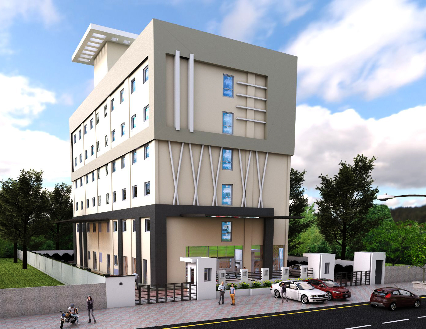 The hotel has double basement and G+5 floors. The hotel has been designed and built to cater to affordable hotel section. There are 72 rooms, along with restaurant and gym.
